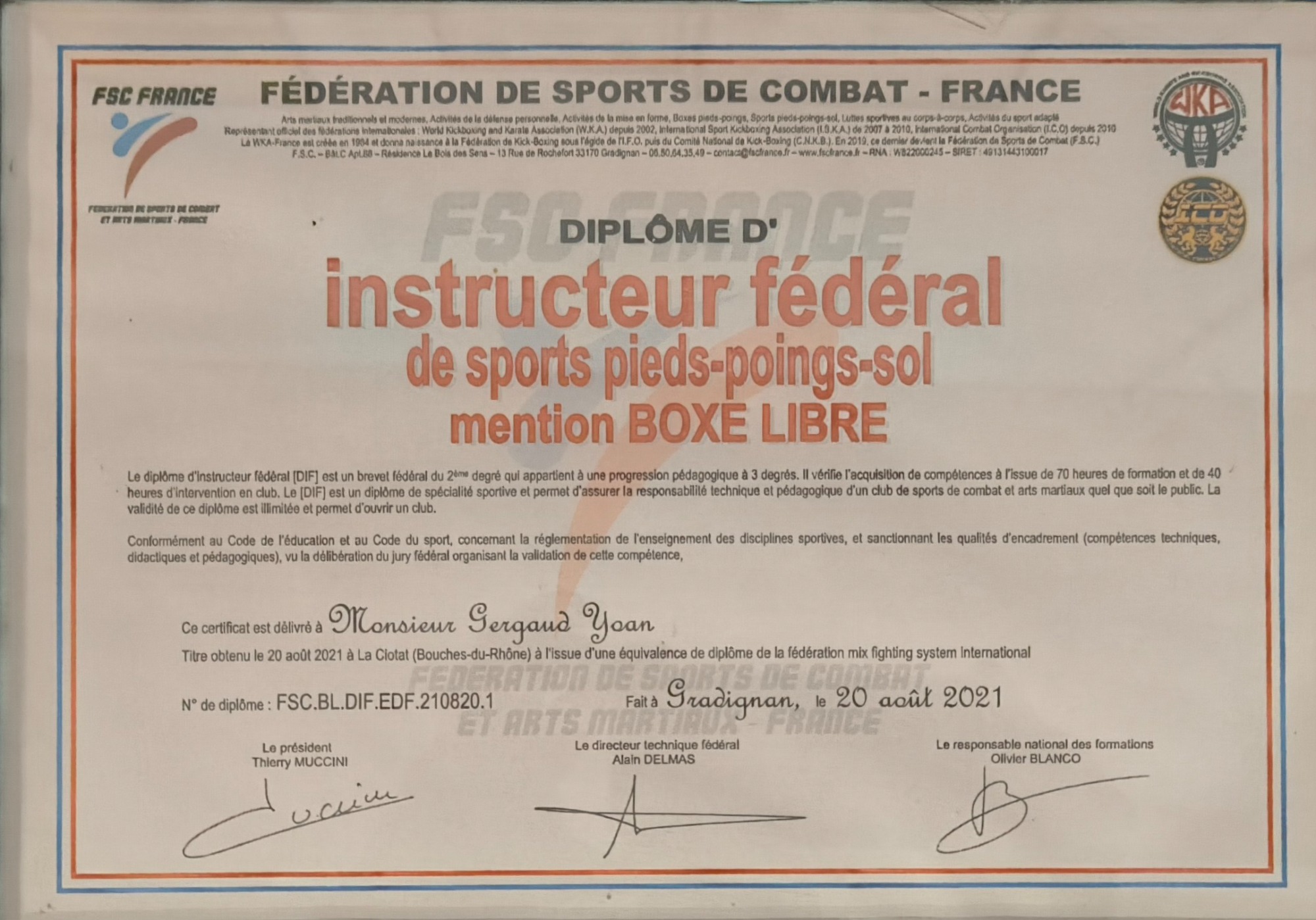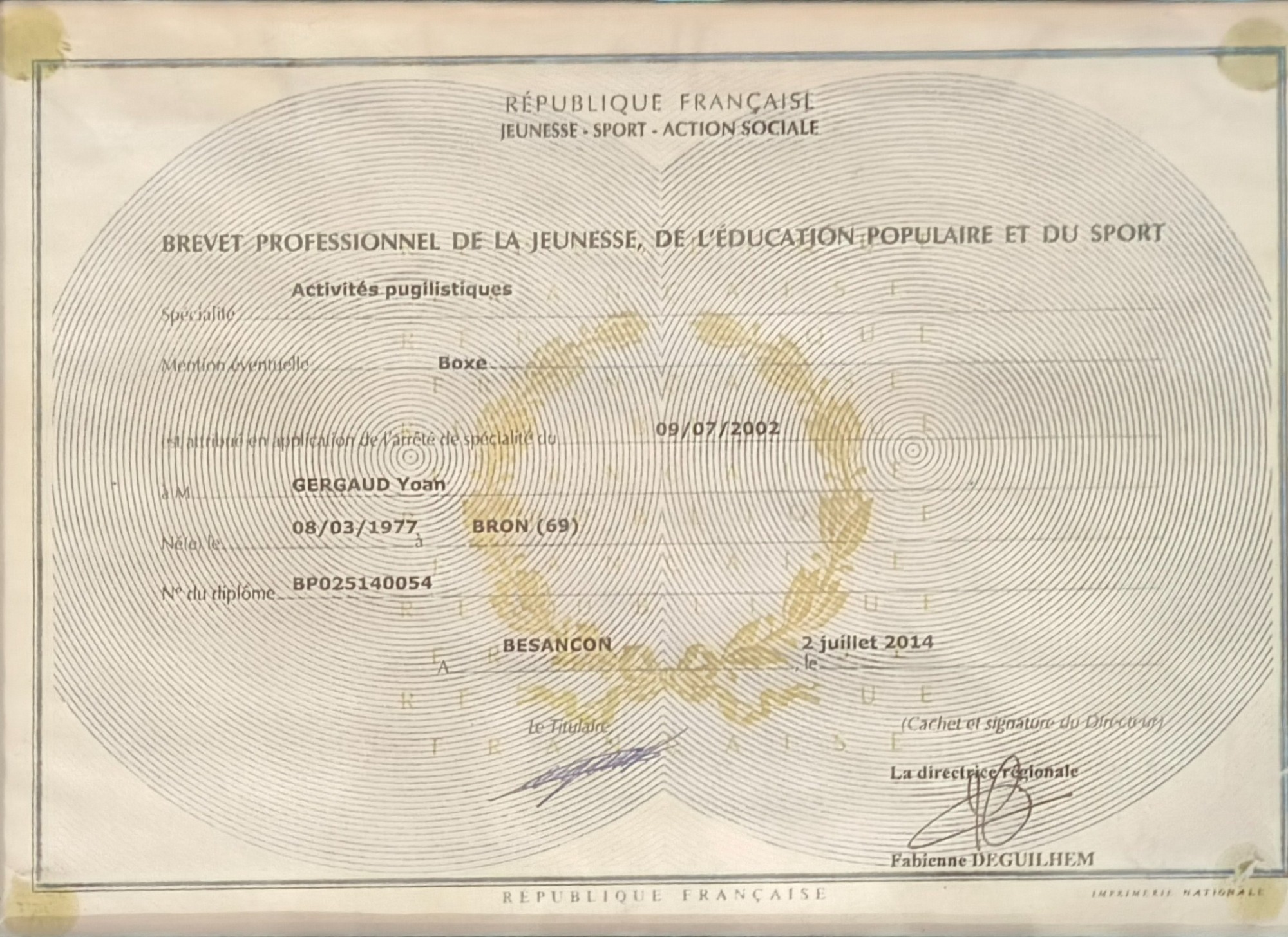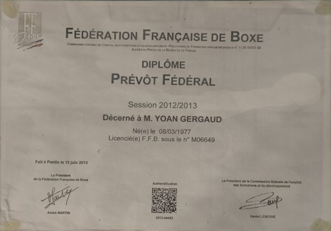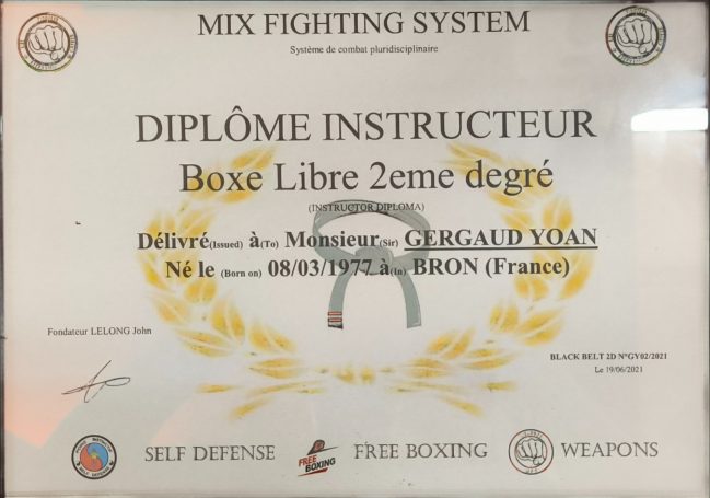 Educateur Sportif de l'Année 2019, Rhône d'Or du Sport, je reçois en 2019 la Médaille de la Ville de Montagny, BPJEPS activité pugilistique mention boxe, Brevet fédéral 2 Mixed Martials Arts, Instructeur Mix Migthing System, Instructeur Self Défence CN 2éme Dan, dépositaire des marques Body Explosion® Fitness Boxe ® et Cardio Boxe ®, préparation physique, personal training, sport en entrprise